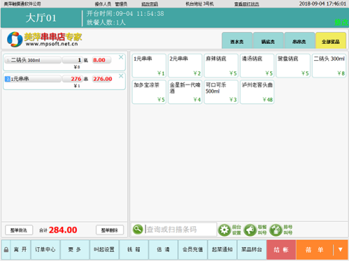 美萍串串店专家是一款专为中小型餐饮企业设计的经营型管理软件,可在多种类型电脑设备上进行全触摸屏操作也可以键盘鼠标操作,界面简洁、操作直观、无需培训,特别设计了利用称重计算签子数量的功能,极大减轻服务员的每日大量重复工作,完全切合串串店行业特点,更优化消费点单流程,一单更快2秒完成,彻底解决点餐中的各种困扰,让消费收银真正又快又好;后台有完善的各项管理和强大的报表统计,让您的管理真正简单到底!广泛适用于串串店等企业